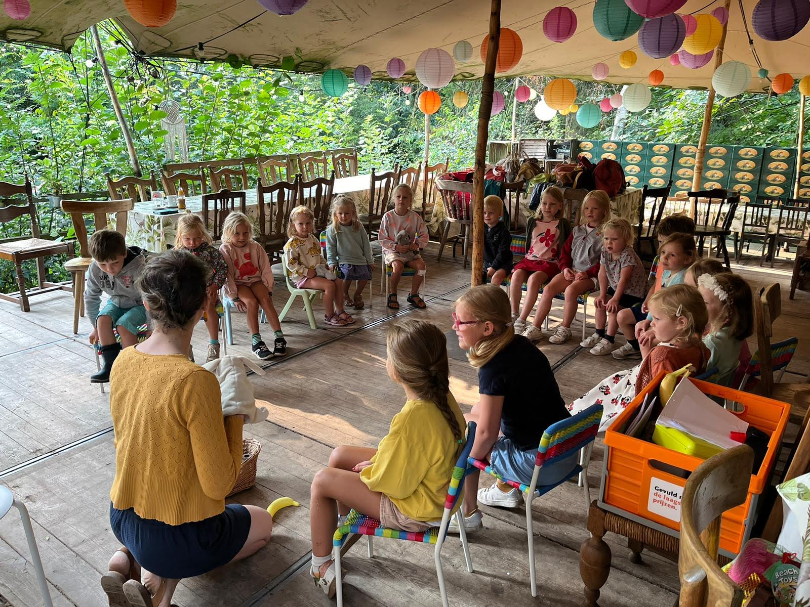 – In de tent van ‘Hof den Tuitelaar’ vol groen en rust en véééél plaats om buiten te spelen