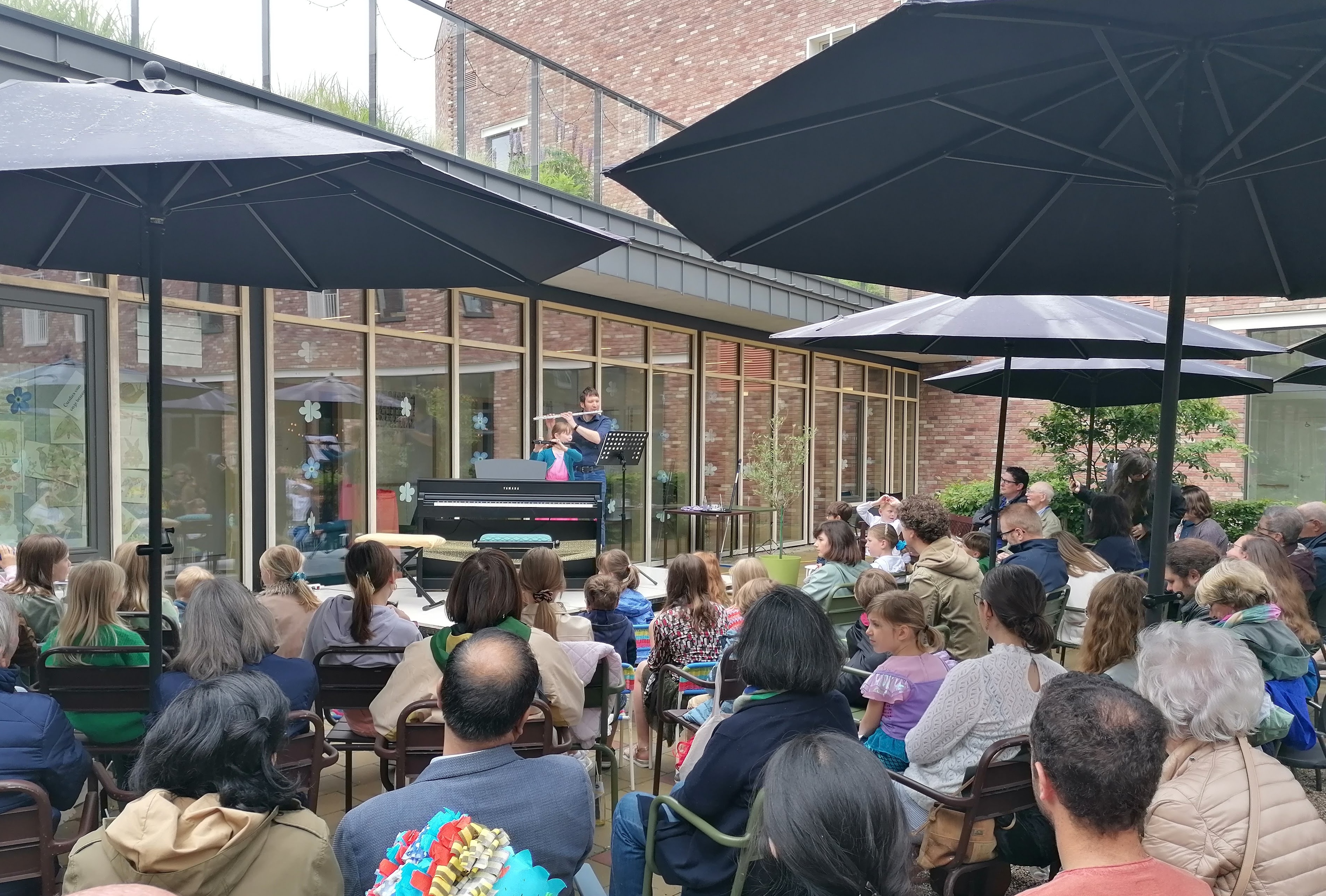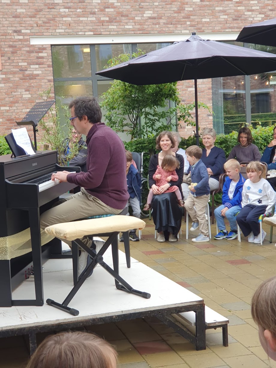 het werd een heuse tournée langs de 4 afdelingen en tot slot ook in de cafetaria. Daar konden ouders en andere muziekliefhebbers ook komen luisteren!
